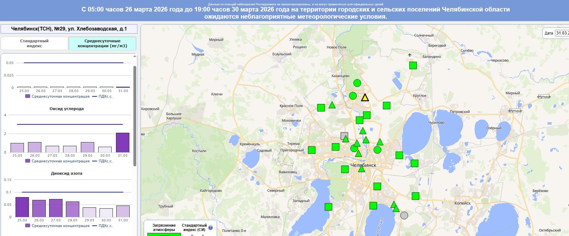 Согласно данным единой системы мониторинга, превышение концентраций загрязняющих веществ — оксида углерода и взвешенных частиц — зафиксировано лишь на одном посту, расположенном по адресу Хлебозаводская, 1 в Металлургическом районе.