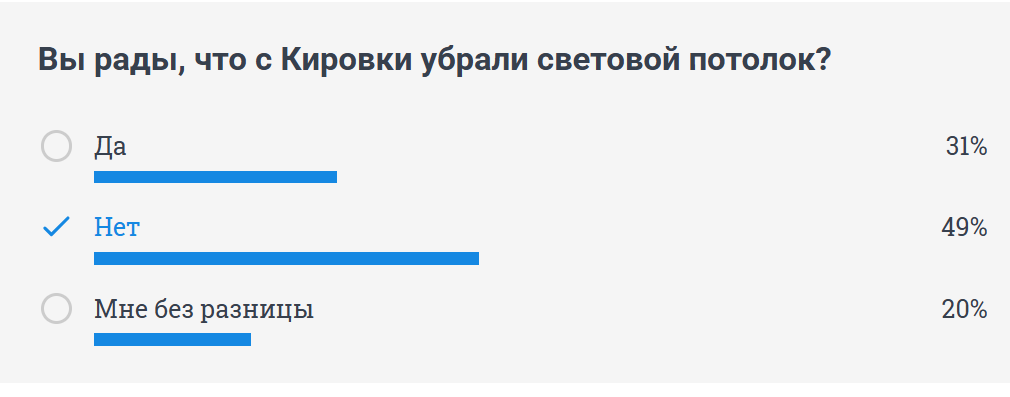 Согласно опросу, проведённому среди читателей, более половины респондентов не поддержали решение об удалении иллюминации с Кировки.