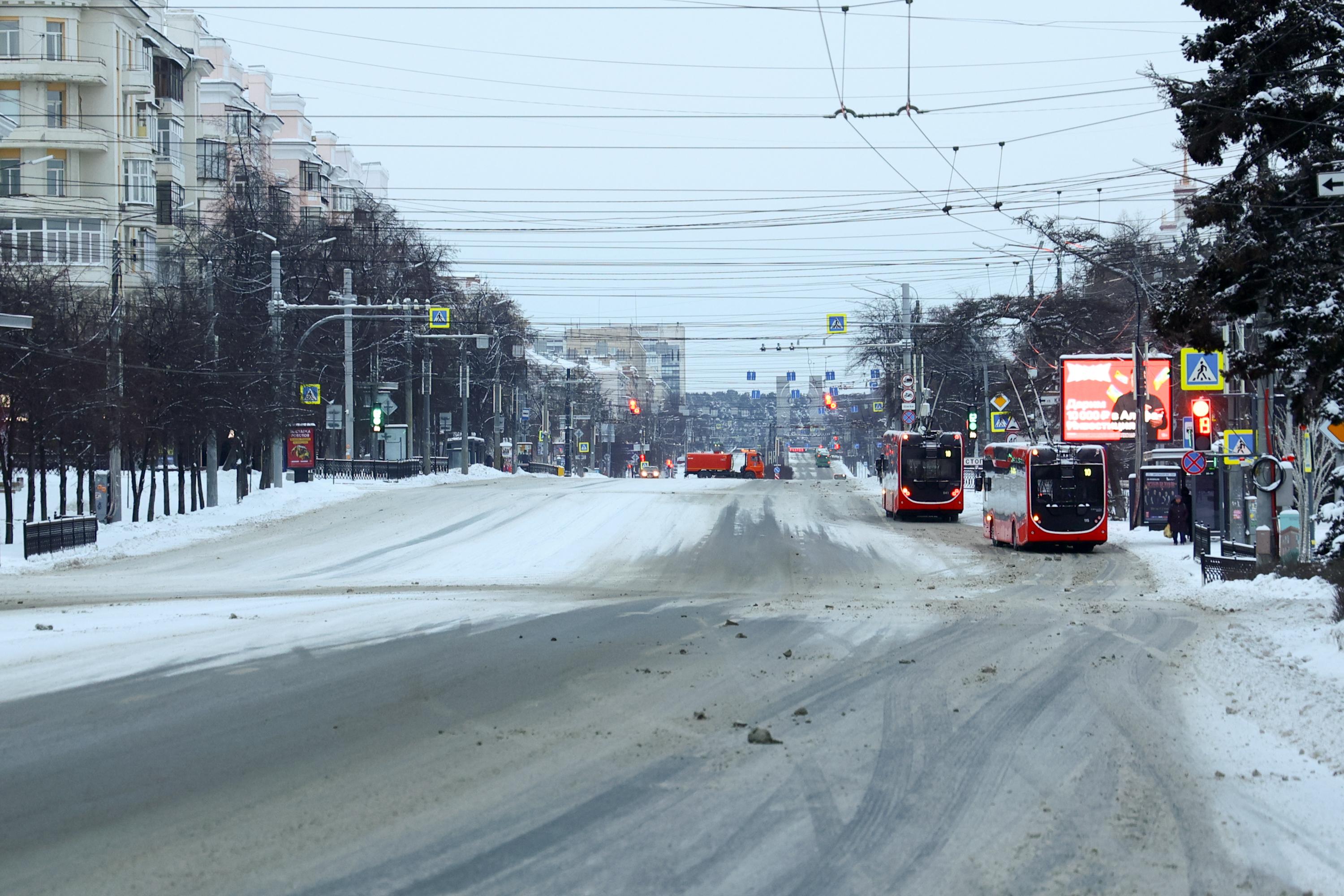 Проспект Ленина постепенно приходит в движение ещё до полудня, на дорогах активно работают снегоочистители