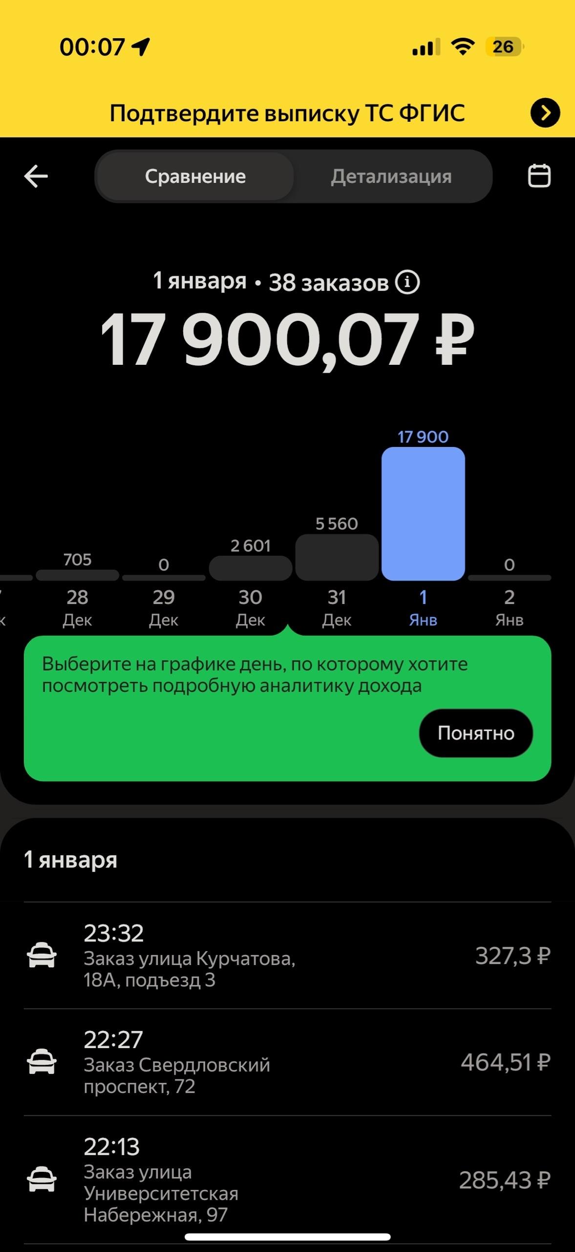 Андрей первого января выполнил 38 заказов и получил 17 900 рублей. Он уточнил, что эта сумма не включает затраты на топливо. На бензин у него ушло около трёх тысяч рублей. Для сравнения, 31 декабря он заработал лишь 5500 рублей.